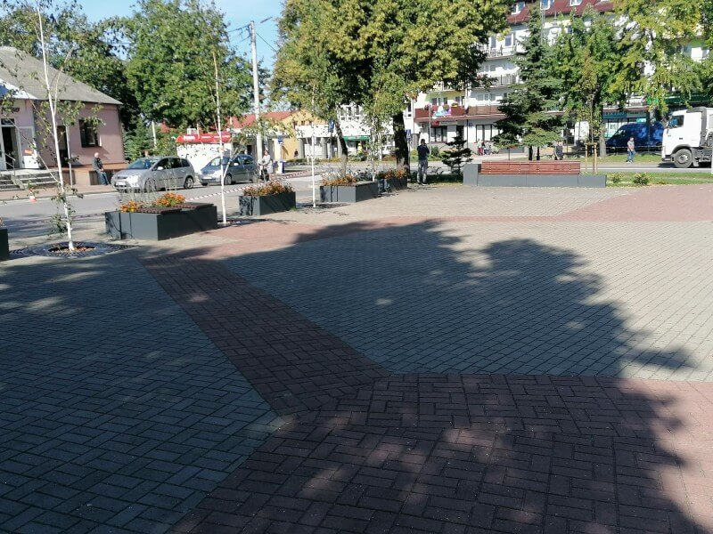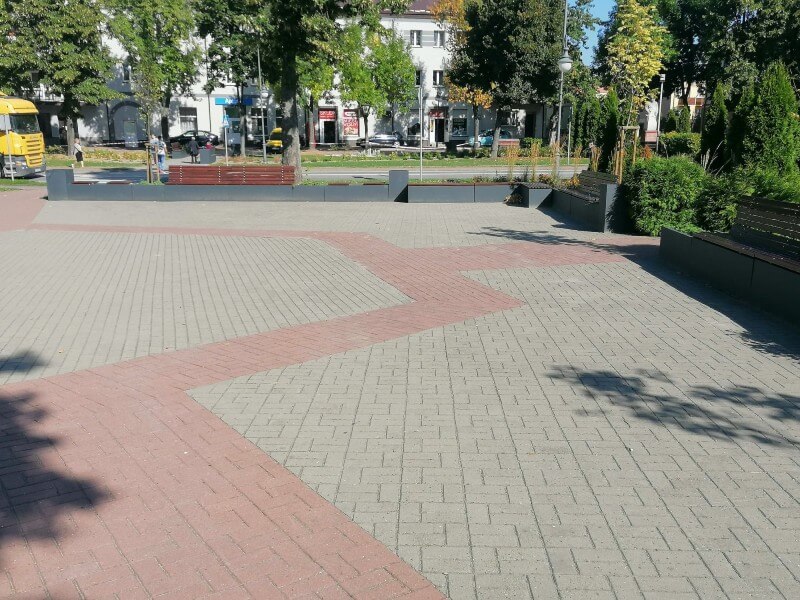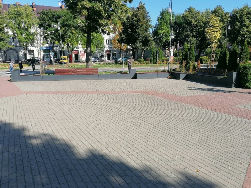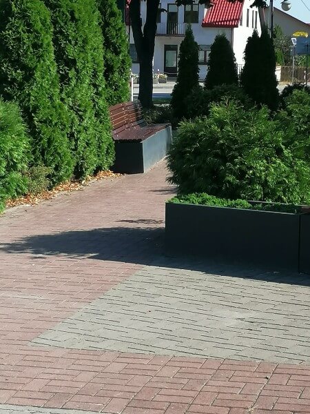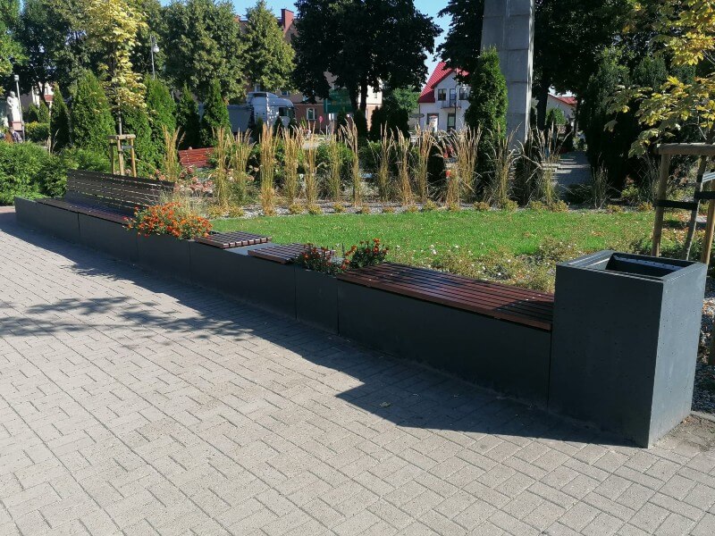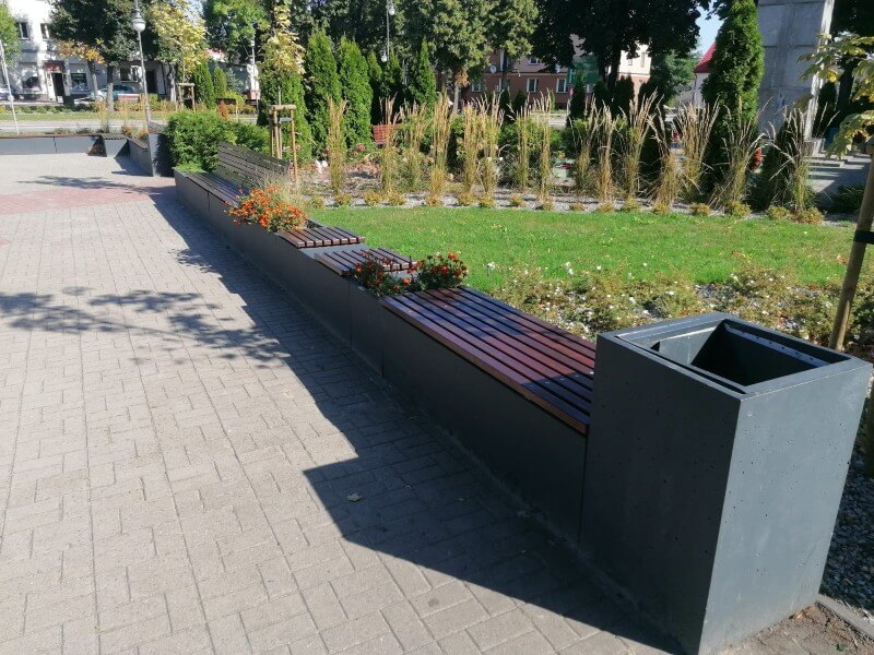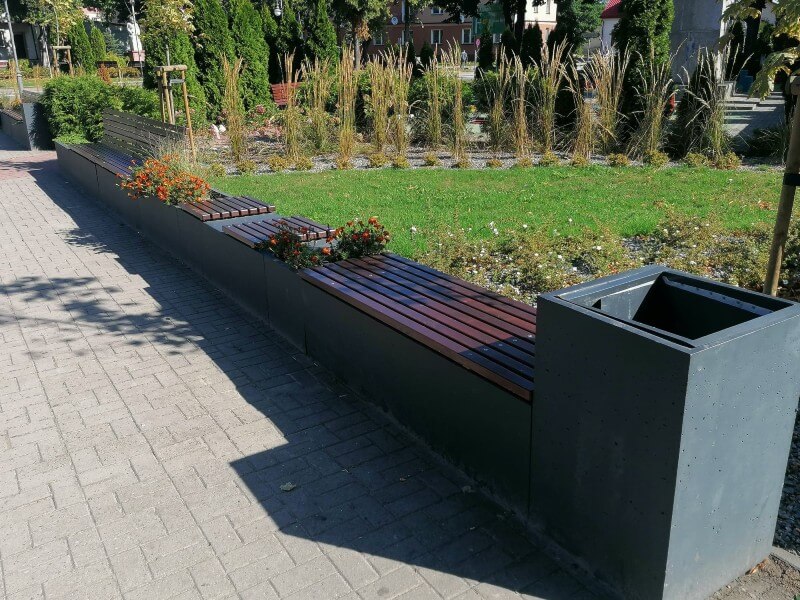 Zastosowanie naszej kolekcji Promenada składającej się z prostych geometrycznie donic i koszy, oraz ciekawie rozwiązanych ławek.